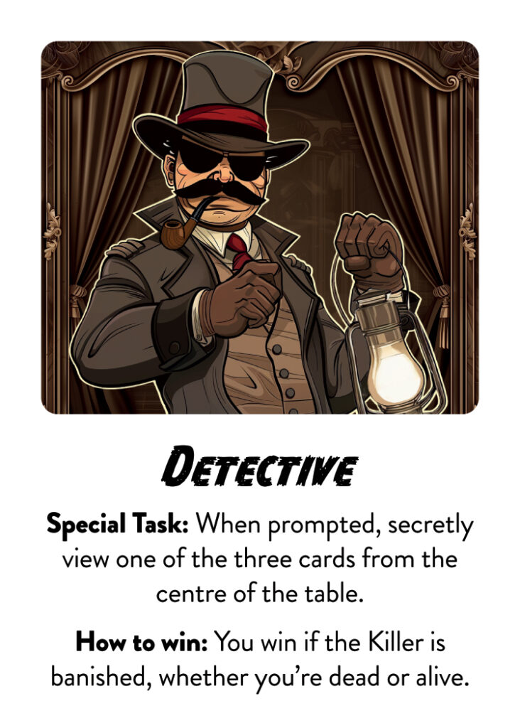 Place the killer card back in the Playing Deck, shuffle again, and deal everyone a card face down. Everyone must view their card to see what role they have been assigned. Place your card back on the table in front of you (facedown and near to the 3 centre cards). You MUST NOT show your card to any other player, and you must not touch your card again until instructed to do so.