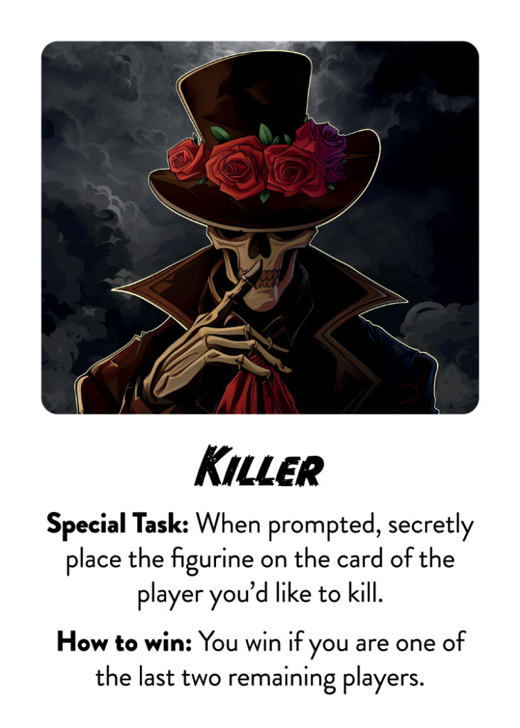 Remove the Killer card from the Playing Deck, put it to one side, and shuffle the remaining cards in your Playing Deck. Then, place 3 character cards from your Playing Deck face down in the centre of the table.