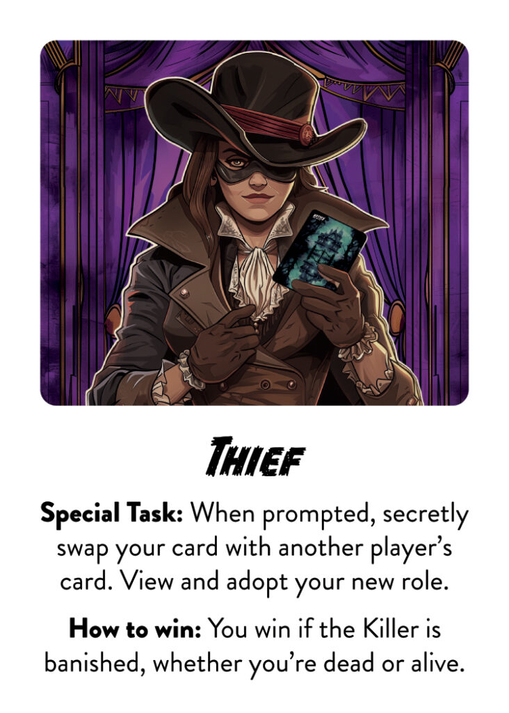 After opening your eyes, the murdered player must remain silent. The day phase is your opportunity to question each other and try to work out who the killer is. Players have 2 options: vote another player out, or skip vote to enter the night phase without banishing anyone. If the killer is not voted out after the banishment procedure, the murdered player reveals their card, every player secretly checks their card (to see if the thief swapped their role), then you enter the night phase. Repeat this process until there is a winner (the win conditions are on the cards).